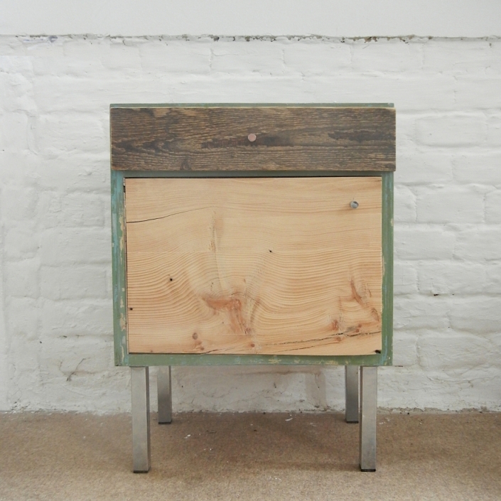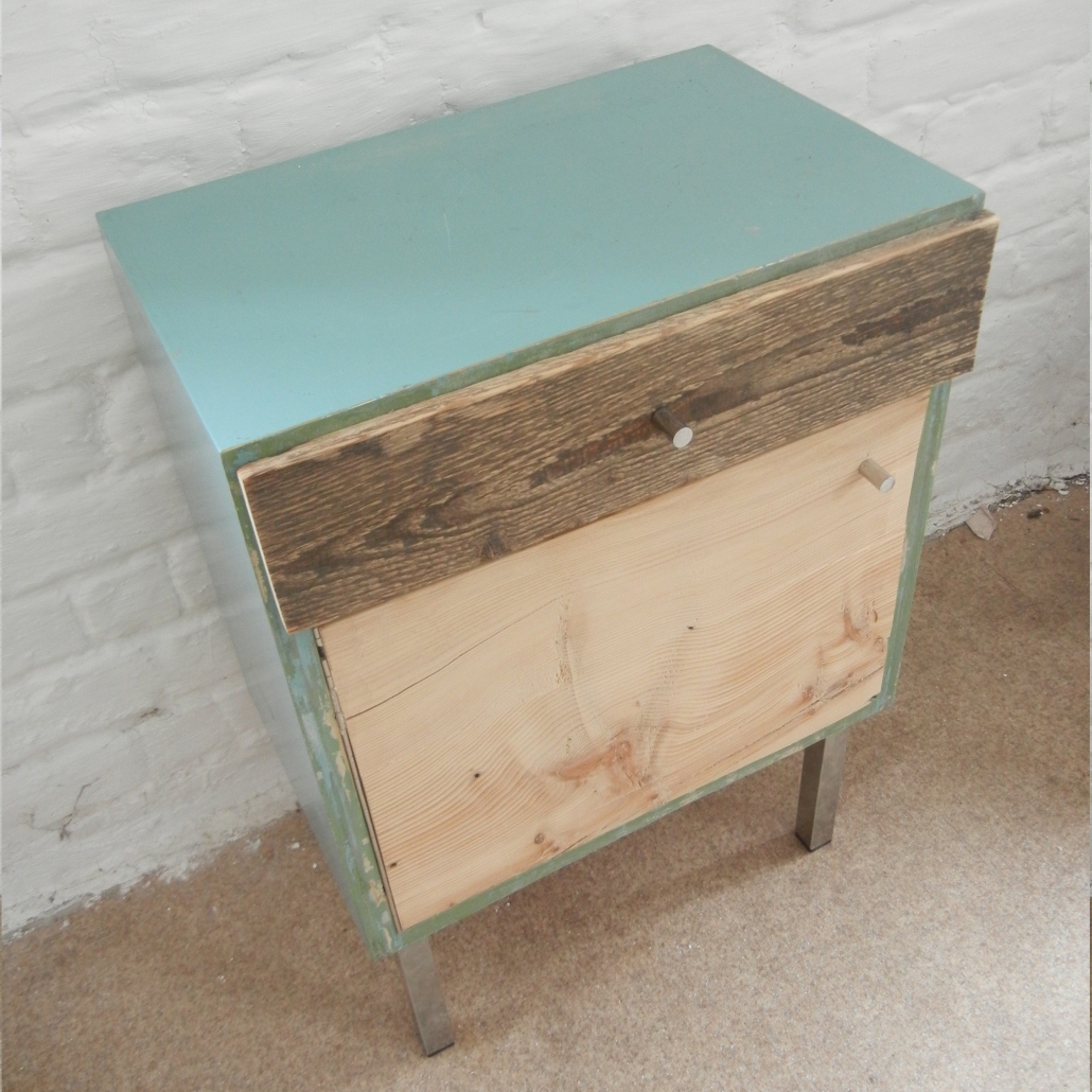 Nachttisch aus einem hellblauen Korpus mit Fronten aus verschiedenen Hölzern