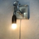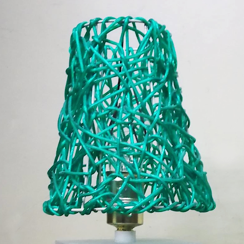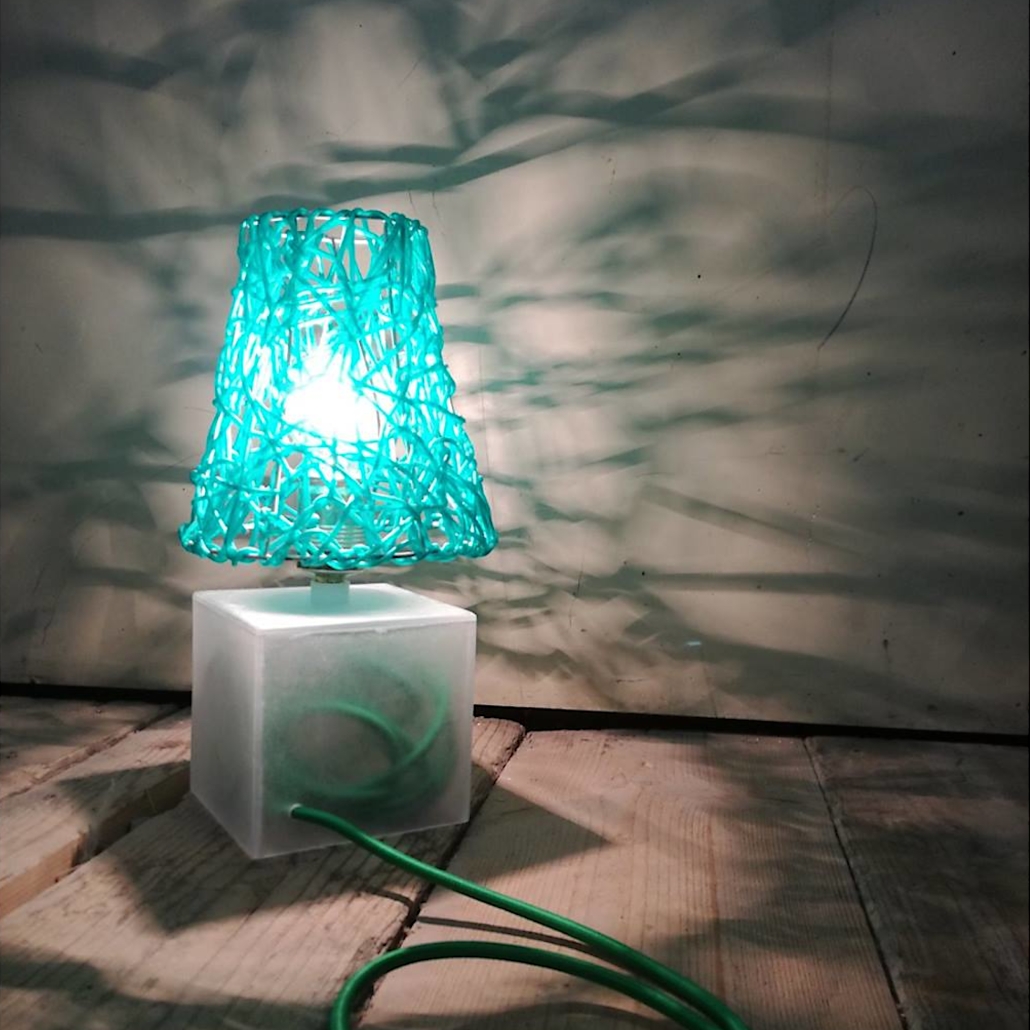 Tischlampe aus Plexiglas mit Schirm aus einer grünen Wäscheleine.