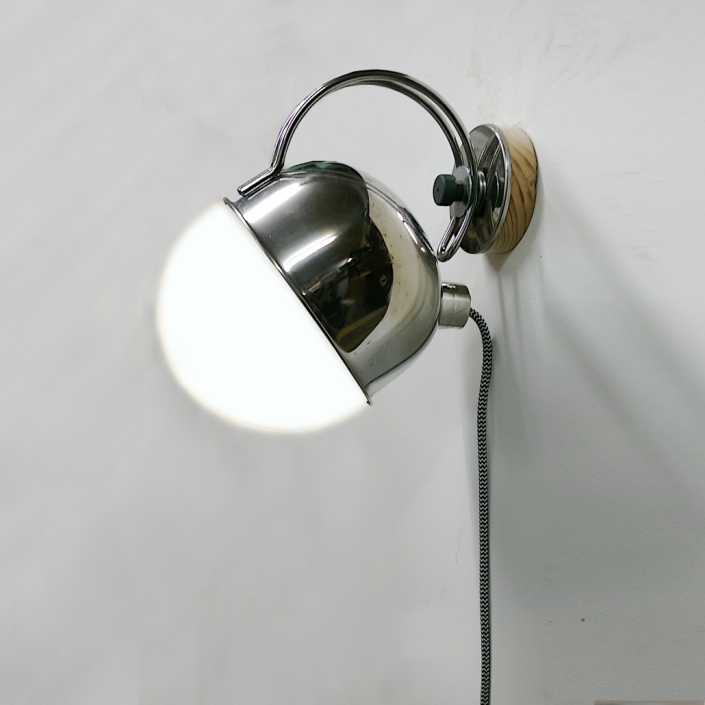 Wandlampe aus einem Teekessel mit Kunststoffschirm, Neigungswinkel verstellbar. Schwarzweisses Stoffkabel, Fassung E27
