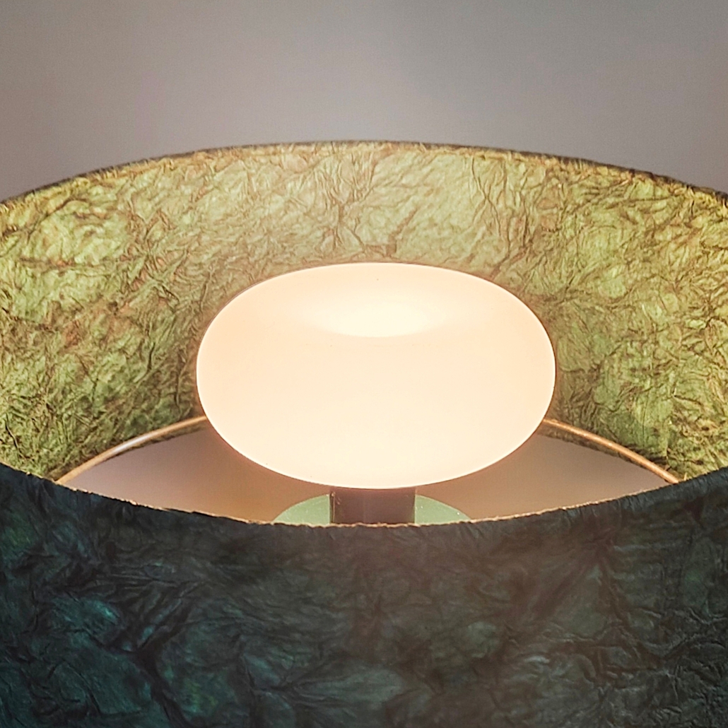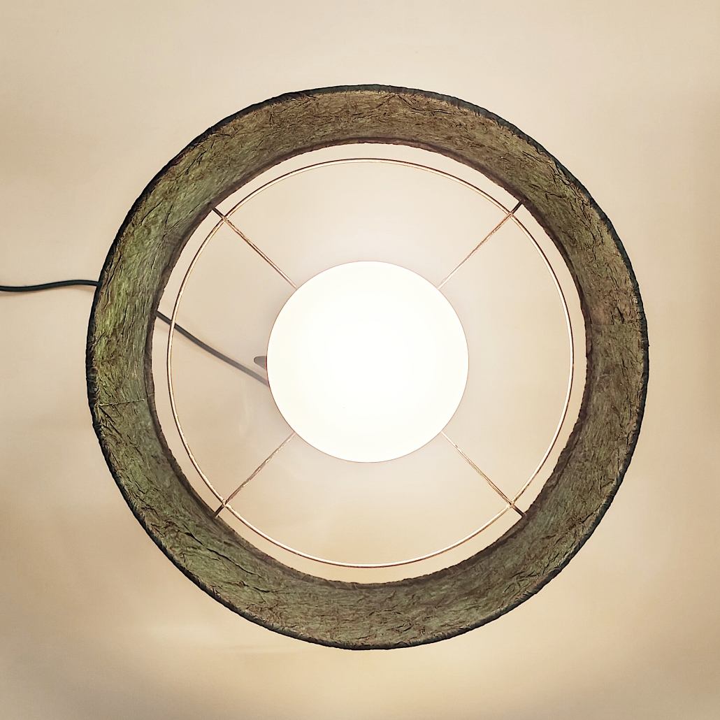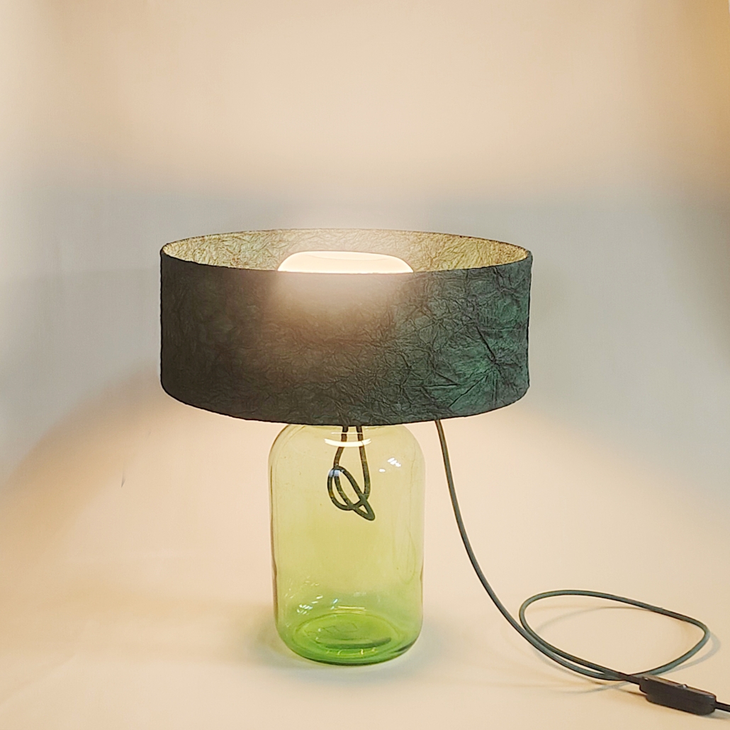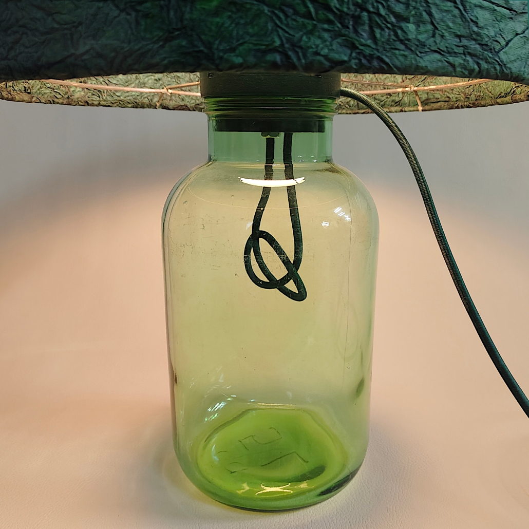 Tischlampe aus einer alten Glasflasche mit handgefertigtem Lampenschirm. Verbindungsstück zwischen Flasche und Schirm: Maßanfertigung aus MDF, Glühbirne in Doughnut-Form E27, grünes Textilkabel.