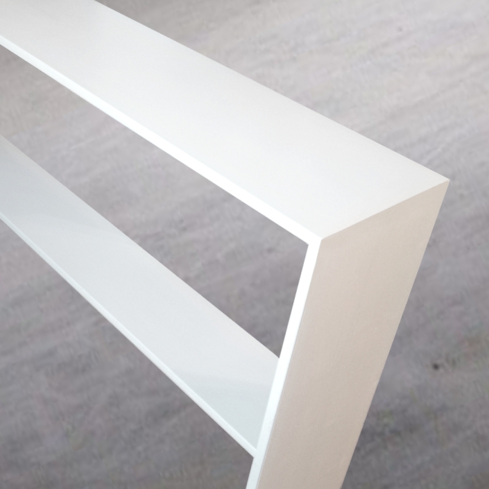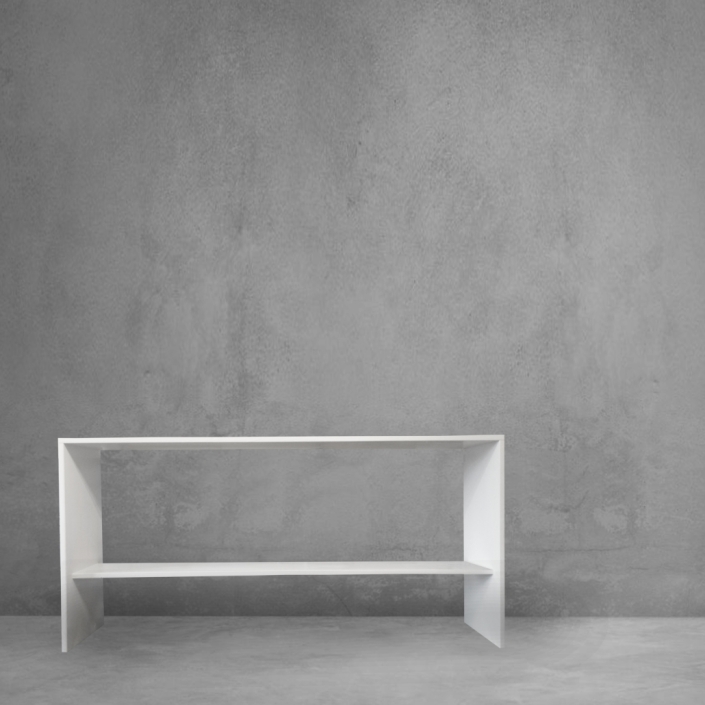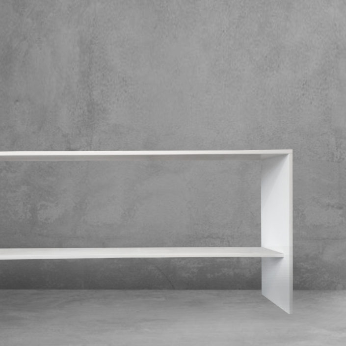 Schlichte, weiße Bank mit Ablage. 3-Schicht-Platte, weiß lackiert.